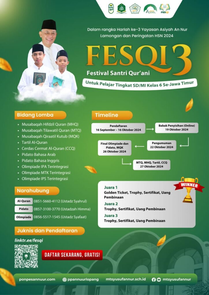 Dalam rangka perayaan hari istimewa ini Yayasan Asiyah An-Nur mengadakan kegiatan “Festival Santri Qur’ani (FESQI)” untuk memperingati Hari Santri Nasional dan Harlah Yayasan Asiyah An-Nur yang ke-3. Kegiatan FESQI ini akan diawali dengan berbagai macam lomba islami yang diantaranya adalah Tartil Qur’an, MHQ (Musabaqah Hifdzil Qur’an), MTQ (Musabaqah Tilawatil Qur’an), CCQ (Cerdas Cermat Qur’an), MQK (Musabaqah Qiraatil Kutub) , Pidato Bahasa Arab, Pidato Bahasa Inggris, Olimpiade IPA Terintegrasi, Olimpiade MTK Terintegrasi, Olimpiade IPS Terintegrasi. Pendaftaran dibuka mulai tanggal 16 September s/d 16 Oktober 2024. Link pendaftran : linktr.ee/fesqi. Narahubung Bidang lomba Al Qur’an dan Kitab Ustadz Syahrul 0851-5660-4112, Bidang lomba Pidato Ustadzah Himami 0857-3100-3770 dan Bidang lomba Olimpiade Ustadz Syafaat 0856-5517-1545.
